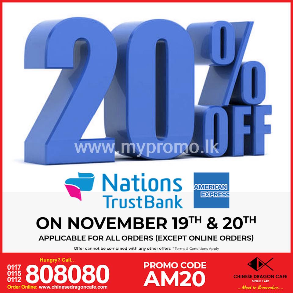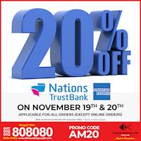 Enjoy 20% OFF on all orders (except online) with Nations Trust Bank American Express Credit Cards.
