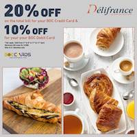 Enjoy 20% off on your BOC credit card and 10% off on your BOC debit card for dine-in and takeaway at Delifrance.