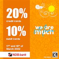 Enjoy 20% OFF on your NDB credit cards and 10% OFF on debit cards at Double XL Flagship Store (Thummulla Junction) and DXL (OGF). Valid only on the 17th& 18th of March. T&C Apply.
