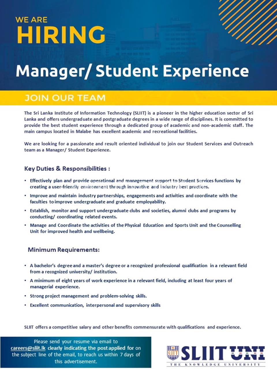 If you are interested in the above position, please send your resume with a cover letter to [email protected] within seven days of this advertisement, clearly indicating the position applied in the subject line of the email.